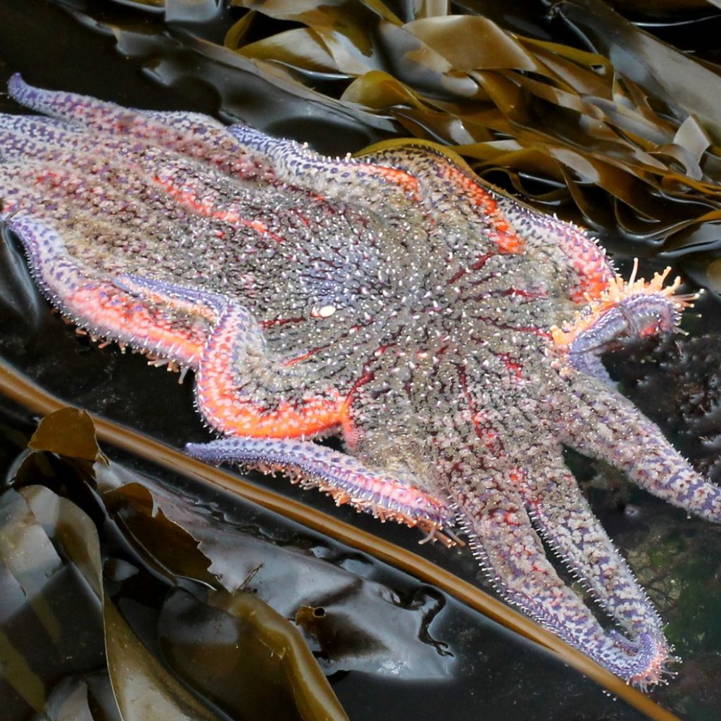 This colourful sea star can be found throughout the coastal Pacific Northwest, happily nestled among the bull kelp beds lining the shores.