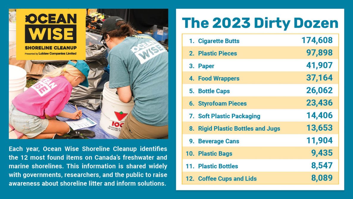 Chaque année, les données scientifiques recueillies par les citoyens dans le cadre du programme Ocean Wise Nettoyage des rivages révèlent la "douzaine sale", une liste des déchets les plus trouvés au Canada.