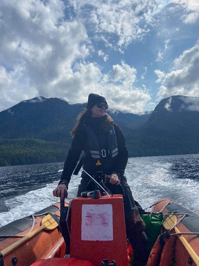 "Cet été, je me trouvais sur les territoires partagés des 'Namgis, des Tawit'sis et des Mamalilikala et je travaillais avec la Cetus Research & Conservation Society à la collecte de données et à la conservation pendant mon stage à distance sur l'île West Cracroft dans le cadre du Robson Bight Warden Program.