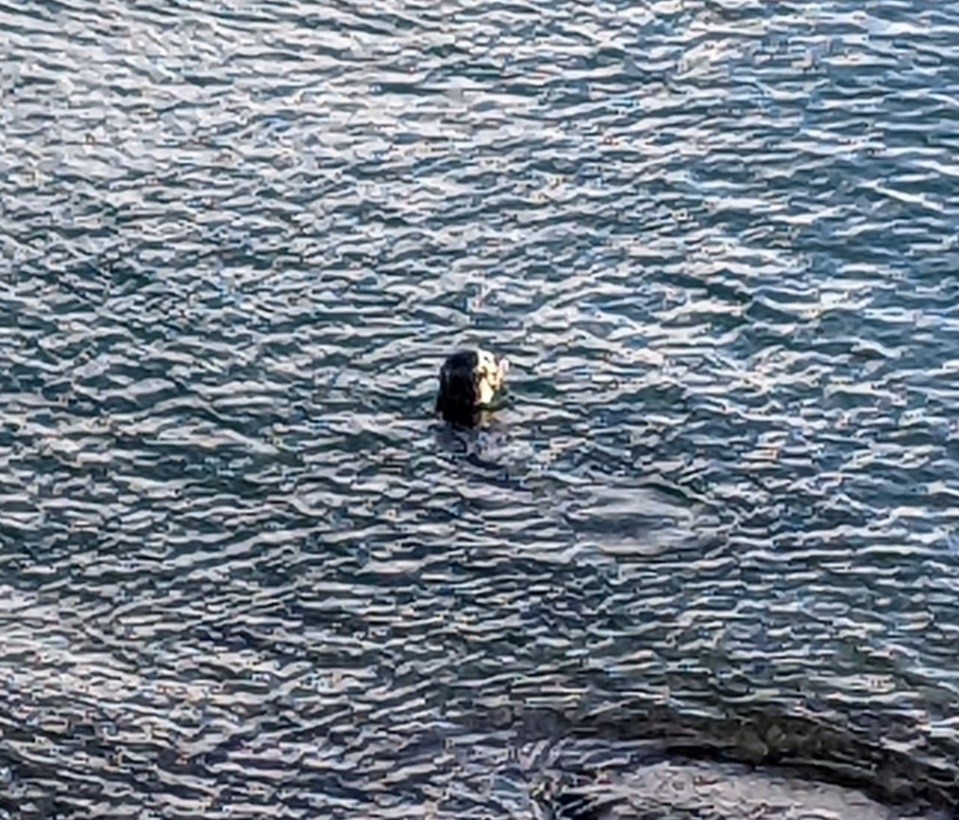 Dès notre arrivée, nous avons repéré un marsouin commun et nous nous sommes précipités pour prendre notre équipement. C'était le premier marsouin que je voyais. Sa petite nageoire dorsale grise émergeait alors qu'il nageait devant nous. Peu de temps après, Stinky, le phoque commun, est apparu juste en dessous de nous, près du rivage. Stinky fera plusieurs autres apparitions tout au long de l'enquête. En regardant le détroit de Géorgie, il était difficile de ne pas se laisser distraire et de ne pas regarder au loin dans mes jumelles.
