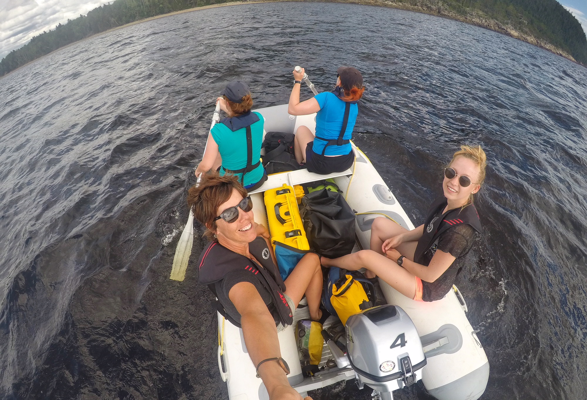 Chacun d'entre nous avait une tâche à accomplir à la tour. Joséphine Schulze était responsable du travail de photo-identification : un aspect important de l'étude qui nous permet de savoir quelles baleines visitent la baie chaque jour. Jaclyn Aubin a utilisé notre petit drone pour survoler les groupes avec des baleineaux ou des jeunes d'un an, ce qui est essentiel pour son projet de maîtrise en sciences sur les soins coopératifs des jeunes. Son étude est très compatible avec notre étude en cours sur la communication mère-baleineau, qui examine comment le bruit peut perturber l'important lien acoustique entre les mères et leurs nouveau-nés (une collaboration entre Ocean Wise et le Groupe de recherche et d'éducation sur les mammifères marins, à Tadoussac).