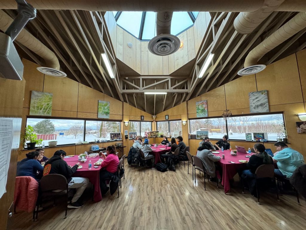 Our first segment, the Mid-Winter Youth Mawio’mi, took place at the Membertou Heritage Park. Commencing with a community feast and a ceremony led by Elder Yvonne Meunier, attendees participated in a sacred offering of a spirit plate to Apuknajit, the spirit of winter. Followed by Jeff Ward singing the bear song in honour of the recent passing of Danny Paul, a knowledge keeper, pipe carrier, dancer, and hunter in our community of Membertou. Then speaker Clifford Paul, the Moose Management Coordinator at the Unama’ki Institute of Natural Resources, enlightened the audience about crucial concepts central to Mi’kmaq ways of knowing and being. Participants delved into the essence of sustainability through the lens of Netukulimk, which encapsulates Mi’kmaq sovereign law and advocates for responsible stewardship of natural resources for the prosperity of future generations. Additionally, M’sit No’kmaq underscored the interconnectedness of all living beings and emphasized the importance of gratitude and reverence towards the Creator. The principle of Two-Eyed Seeing, an approach to learning, blending Indigenous knowledge systems with Western knowledge systems.