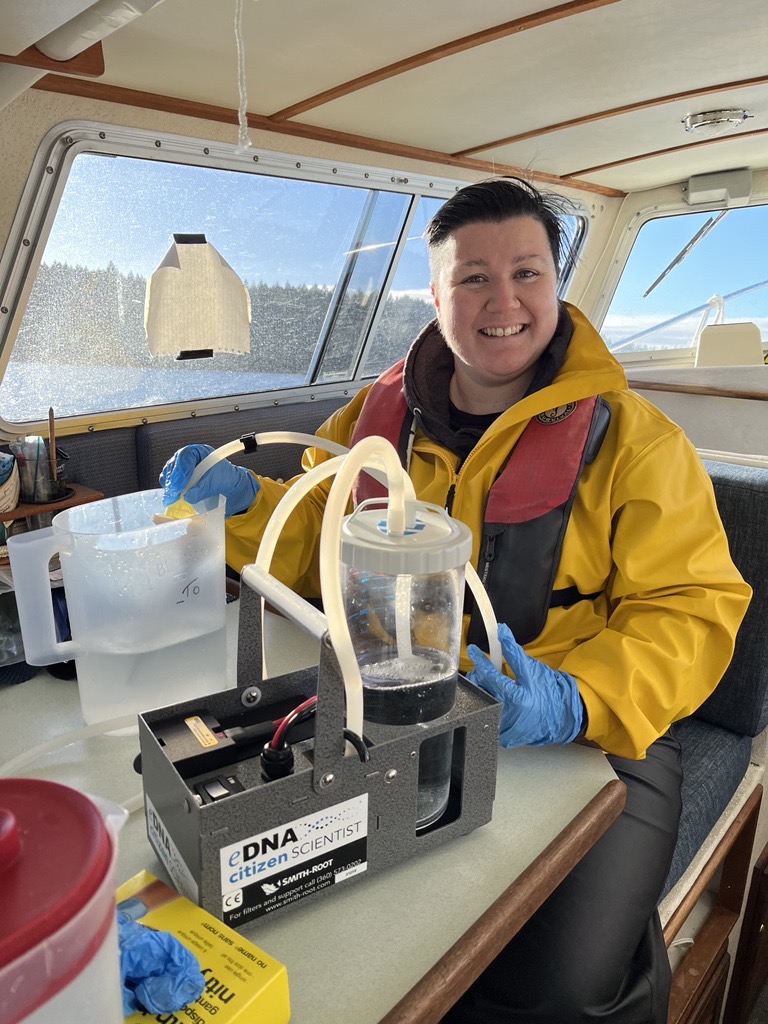 EL: When cetaceans are foraging their prey can also leave behind fragments of eDNA in the water samples that we collect. From this, we’re learning more about the food sources of cetaceans like humpback whales and resident killer whales by sequencing and analyzing these pieces of prey eDNA. This can help us better understand their diets, what fish stocks are important, and what we can do to conserve these species.