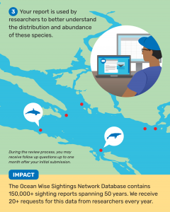 Personal information is stored in the Ocean Wise Sightings Network database to help our scientists contact you if we need more information on a sighting. Sensitive information is not shared outside of Ocean Wise.