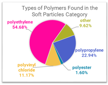 What type of plastics did they find? More than half of the soft plastic pieces discovered were a type of plastic polymer called polyethylene (PE), which is normally used in products like grocery bags, water bottles, and fruit nets. A polymer is a large molecule made of many small units referred to as monomers. The next most common plastic polymers discovered were polypropylene (PP), polyvinyl chloride (PVC), polystyrene (PS), polyester (PET), and others like cellulose, nitrile rubber, polyurethane and glass combined.