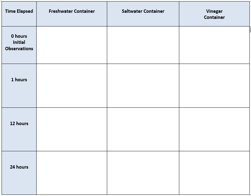 1. Fill one container halfway with fresh water, one with salt water and one with vinegar. There should be enough solution in the container to completely submerge the shell.
