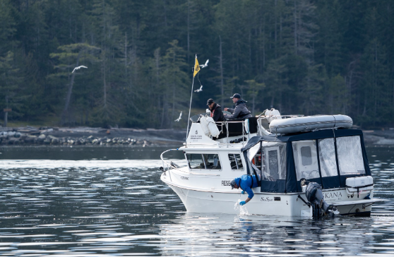 C'est ce que l'initiative Ocean Wise whale a cherché à découvrir ! En vertu du permis de recherche MML-18, l'équipe a passé deux jours à collecter des échantillons de proies et d'ADN environnemental des baleines afin de mieux comprendre leur régime alimentaire hivernal. L'ADN environnemental (ADNe) provient du matériel génétique des cellules de la peau et des matières fécales laissées dans l'eau lorsqu'une baleine plonge. Les chercheurs de Ocean Wise collectent cet ADNe de manière peu invasive à partir de leur navire de recherche, le Skana, en s'approchant de la zone après que la baleine a plongé et en prélevant de l'eau sur l'empreinte de la nageoire caudale (la plaque d'eau calme et circulaire laissée par la baleine après sa plongée).
