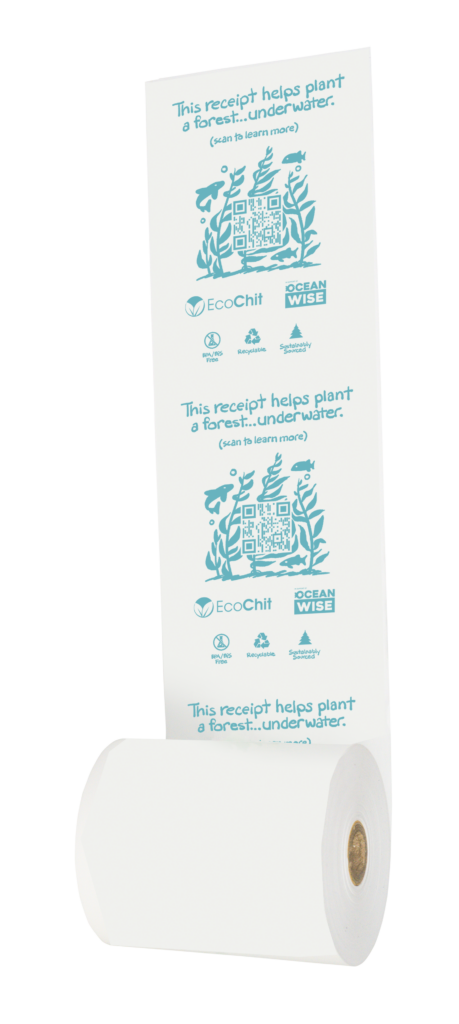 This year we are excited to announce the launch of their newest product line: EcoChit x Seaforestation – in support of Ocean Wise. This new product line will give businesses the opportunity to support Ocean Wise as we explore ocean-based climate solutions through the planting and restoration of underwater kelp forests. To learn more about seaforestation, look for the unique custom print featured on the back of each receipt printed with EcoChit’s paper across Canada! For those interested in taking a deeper dive into the sustainability facts, they have included a scannable QR code to give customers the option to learn more. Their aim is to increase environmental literacy – one receipt at a time!