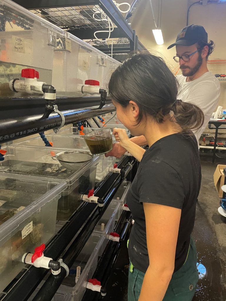 - Growing kelp is more challenging than it appears: the science and practice of seaforestation and kelp restoration are still in their infancy. Various methodologies are being trialed. At the Pacific Science Enterprise Centre (PSEC), they have been experimenting with green gravel which uses inoculated rocks and shells to facilitate outplanting directly from the boat. Contrary to its name, Ocean Wise’s green gravel is more brown than green! The team has also invested in red-light storage, allowing the cultivation of kelp beyond its seasonal limitations by “freezing” it in the gametophyte phase before it fully develops. This method provides a reliable seed source throughout the year and serves as a biobank to preserve genetic diversity for future populations. One thing I have learned during my placement is that the seaforestation team does not shy away from innovative approaches in restoration practices.