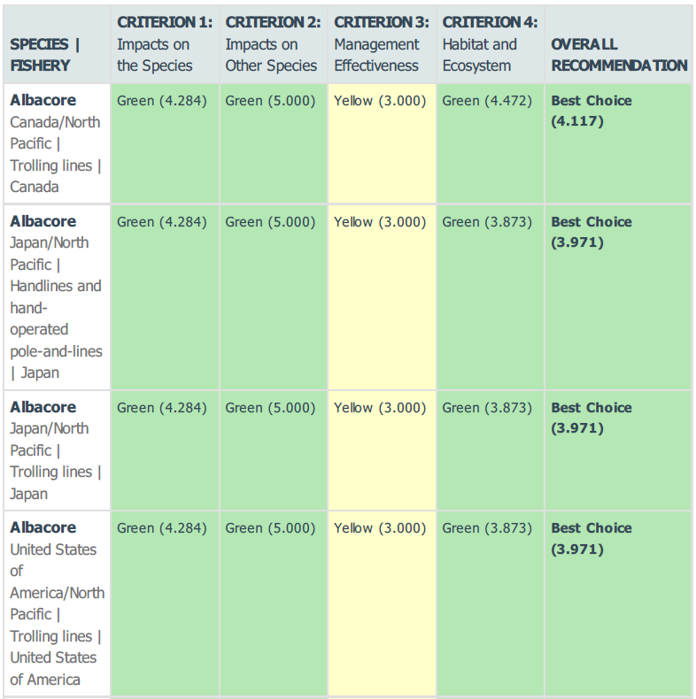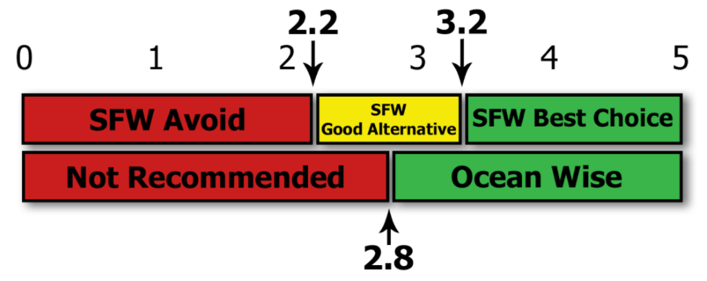 Above you can see how Ocean Wise’s sustainability line of 2.8 compares to the Seafood Watch program three-tier system.