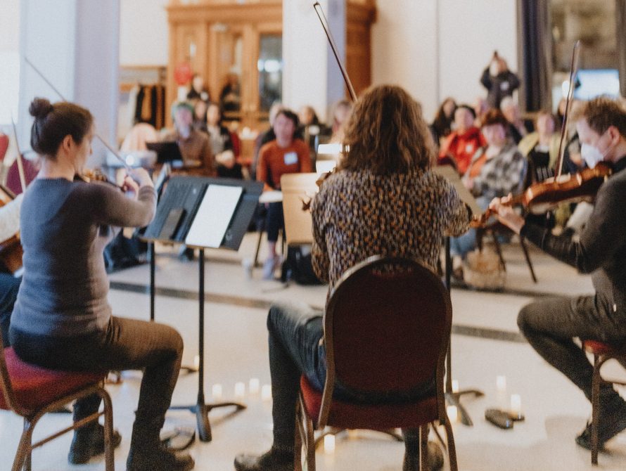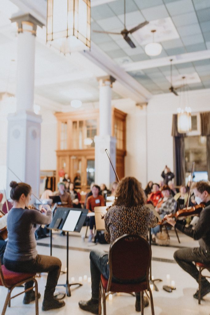 Nous avons été époustouflés par les réactions que nous avons reçues à la fin de la soirée. Nous avons pris des risques importants avec notre programme parce que nous voulions pousser nos invités et les musiciens à faire partie de l'événement ensemble, plutôt que d'avoir une relation transactionnelle entre le public, l'artiste et l'hôte, et heureusement, nous avions un groupe très disposé à le faire. Le fait d'ouvrir un événement en demandant à un groupe d'inconnus de chanter ensemble a créé une expérience magique où chacun était prêt à se montrer vulnérable, ce qui a donné le ton pour le reste de la soirée et a donné lieu à des discussions très profondes par la suite. Nous avons également engagé le plus merveilleux quatuor à cordes, qui était prêt à essayer quelque chose de différent.