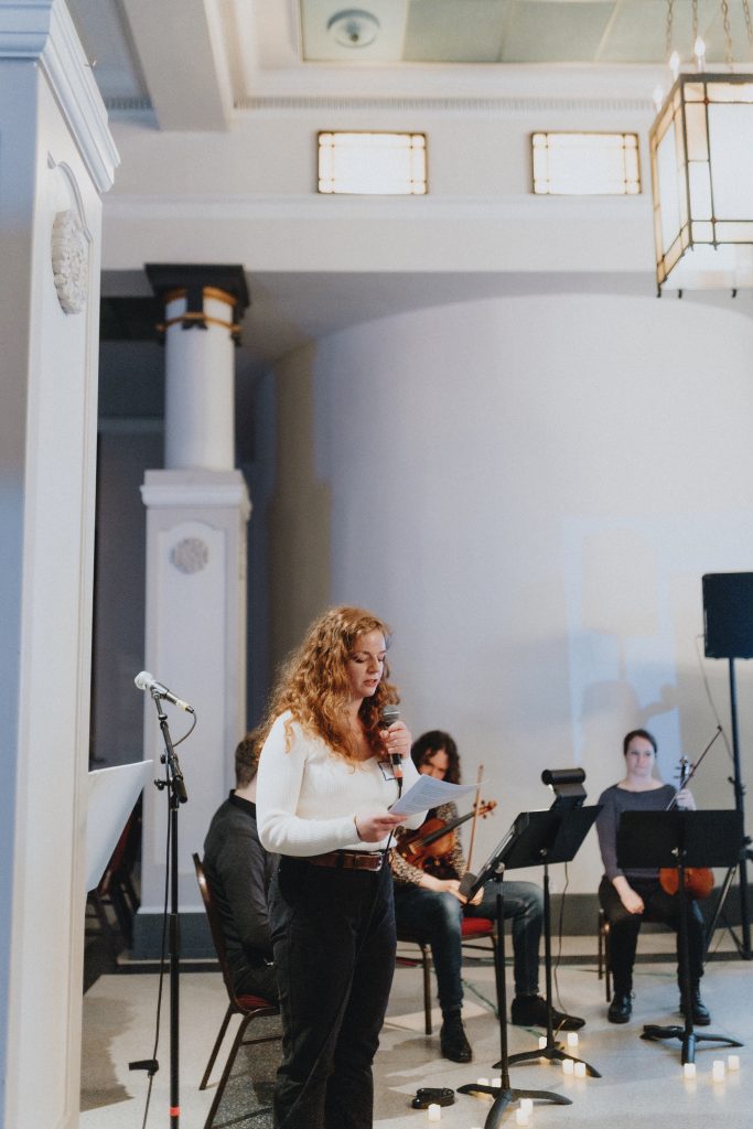 Nous avons commencé la soirée par une ouverture à froid de la part des musiciens et des présentations de la part des responsables de projet, puis nous avons demandé au public de chanter ensemble avant que les musiciens ne se produisent. Une fois que la musique a fait naître des idées chez les participants, nous avons directement entamé le dialogue. Le dialogue a débouché sur ce que nous avons appelé l'"improvisation collective", au cours de laquelle nous avons demandé aux musiciens d'improviser un morceau de musique sur un film muet composé d'images de nos moments préférés dans la nature provenant de la communauté. Pendant l'improvisation collective, nous avons également donné au public la liberté de se déplacer dans la salle et d'écrire sur la manière dont la musique les aidait à se connecter les uns aux autres ou au changement climatique.