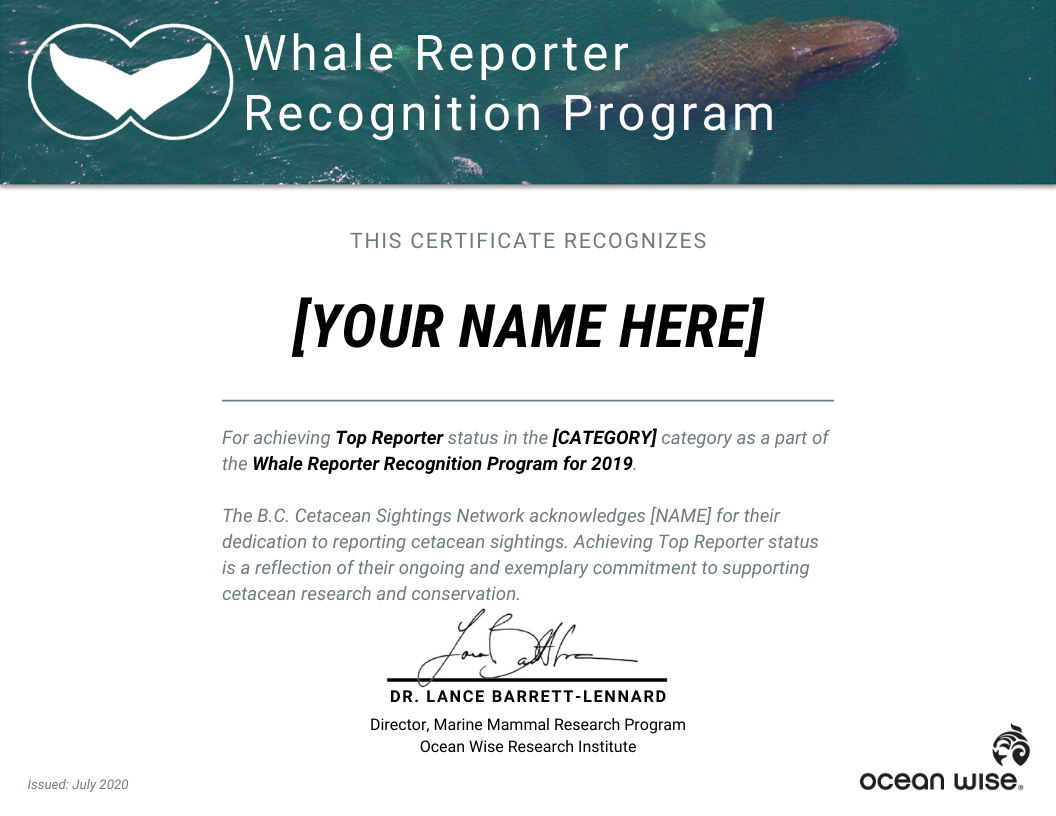 Étant donné l'importance des observations de cétacés pour la conservation, nous avons estimé qu'il était important de créer un programme pour remercier les citoyen.ne.s scientifiques dévoué.e.s qui rendent possibles les efforts de recherche et de conservation du BCCSN. C'est dans cette optique que nous avons lancé le Programme de reconnaissance des rapporteurs de baleines. À partir de cette année, nous récompenserons chaque année les rapporteurs qui se distinguent par leur dévouement exceptionnel et leur constance dans la fourniture de rapports d'observation. Pour les célébrer et permettre à leurs réalisations d'être partagées publiquement, les meilleurs rapporteurs se voient remettre des autocollants de fenêtres et électroniques « Top Reporter » pour souligner leur statut dans leur entreprise et en ligne, un certificat de Top Reporter et une exposition dans diverses sources médiatiques, y compris WildWhales du BCCSN(www.wildwhales.org/recognition).
